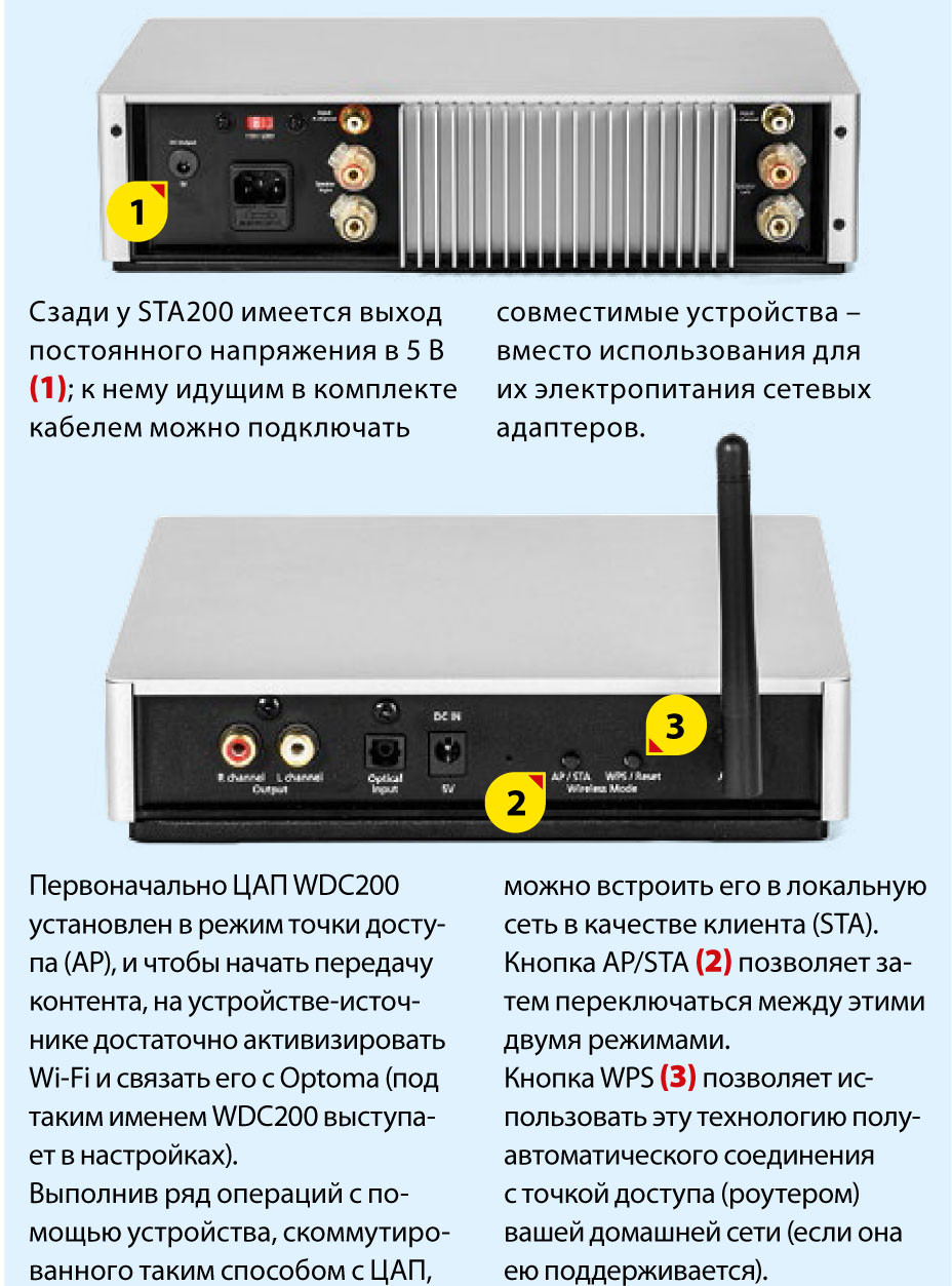 Подключить этот ЦАП Optoma NuForce можно тремя способами: наладить непосредственный контакт между вашим устройством и WDC200 (Direct Connection), встроить его в локальную сеть в режиме клиента (Client Mode) и посредством технологии WPS. Для уверенного пользователя ПК эта процедура не составит проблемы, тем более с имеющимся «Руководством». Владельцы устройств Apple сразу же могут приступать к трансляции своей музыки – будет задействована функция AirPlay. На компьютеры с Windows 7 и гаджеты под Android надо будет установить подходящий программный плеер.