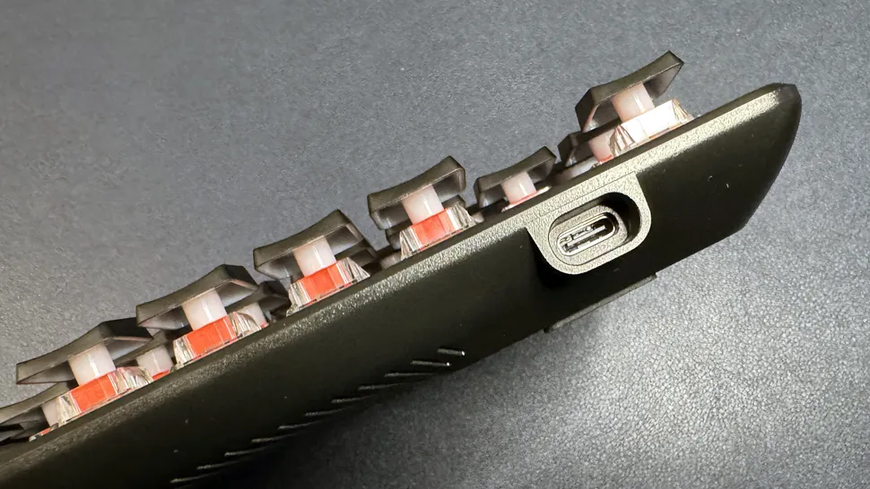 Vulcan II TKL — это проводная клавиатура со съемным кабелем USB-C, порт которого расположен сверху, с левой стороны. На задней панели клавиатуры вы найдете два набора пластиковых откидных ножек, а также четыре нескользящие резиновые накладки среднего размера, которые удерживают клавиатуру на месте во время интенсивных игровых сессий. У меня не возникало проблем с тем, что клавиатура скользила по столу во время набора текста или игры, но я не особо эмоциональный геймер.