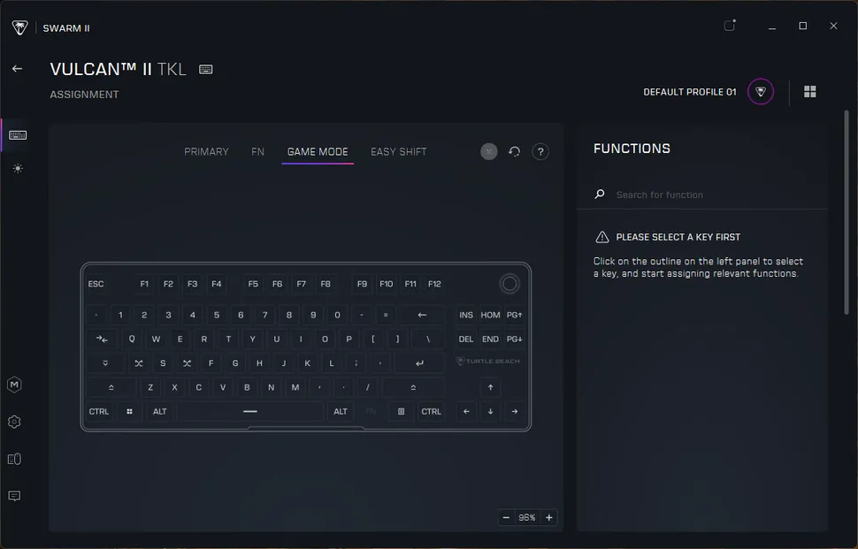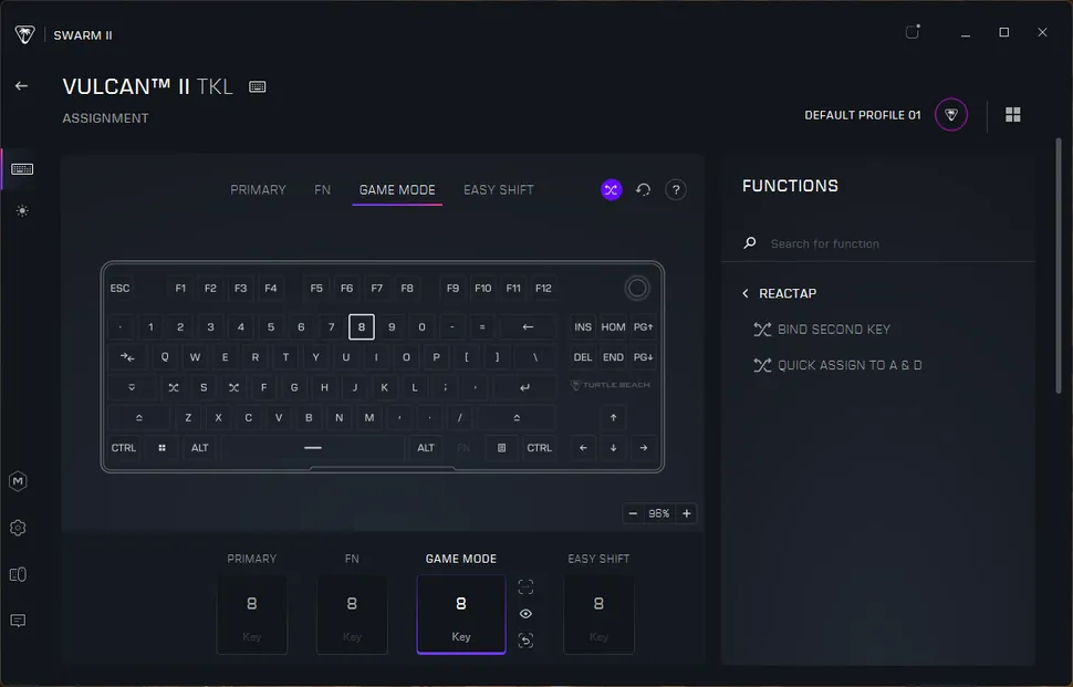 Клавиатуру Vulcan II TKL можно настроить с помощью Swarm II от Turtle Beach — универсального программного обеспечения для периферийных устройств, которое компания Turtle Beach унаследовала после полного поглощения Roccat. С помощью Swarm II можно переназначать клавиши, настраивать RGB-подсветку клавиатуры, обновлять прошивку и настраивать ReacTap — аналог Snap Tap / SOCD от Turtle Beach. Это программное решение, которое позволяет привязать два действия к одной клавише, чтобы активировать второе действие, нажав на клавишу, не отпуская полностью первую (как и Snap Tap, ReacTap отдает приоритет последнему нажатому действию. Как и Snap Tap и другие варианты этой функции, она может считаться читерством в некоторых играх.