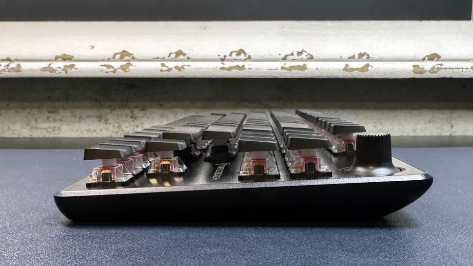 Клавиатура заключена в тонкий пластиковый корпус с верхней панелью из матового алюминия. Она доступна только в одном цвете (чёрном) и довольно компактна: её ширина составляет 14,42 дюйма (366,16 мм), глубина — 5,41 дюйма (137,22 мм), а толщина, включая колпачки клавиш, — 1,27 дюйма (32,15 мм) (корпус намного тоньше — 0,65 дюйма / 16,6 мм в самом толстом месте). Несмотря на то, что это не самая тяжёлая клавиатура — она весит 1,29 фунта (584 г), — она выполнена в премиальном стиле: пластиковый корпус имеет скошенный край, который находится на одном уровне с алюминиевой верхней панелью, и всё выглядит очень прочным. В правом верхнем углу находится тонкая пластиковая ручка регулировки громкости (с фиксацией), единственная «дополнительная» клавиша на клавиатуре.