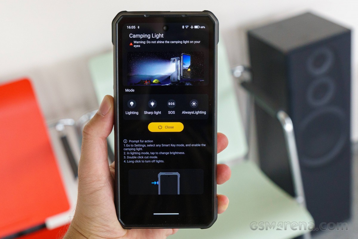 Фонарь для кемпинга, как его называет Ulefone, состоит из 585 светодиодов и светит невероятно ярко — 1100 люмен, как мы уже упоминали. Для включения фонаря можно настроить специальную кнопку на левой стороне телефона. Фонарь для кемпинга имеет несколько режимов и возможность плавной регулировки яркости.