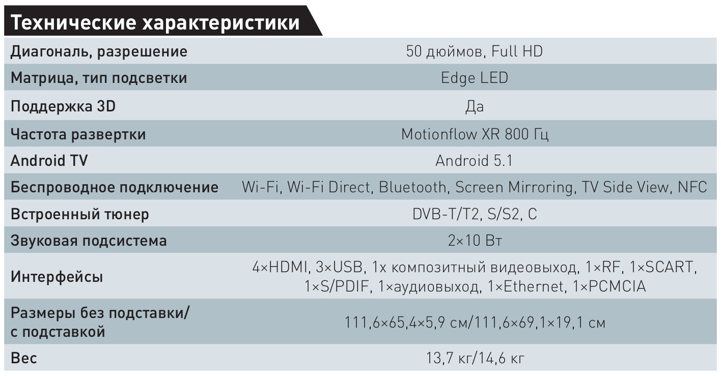 О комплектации можно сказать в двух словах: подставка цвета металлик и пульт для управления. К некоторым моделям прилагается еще и сенсорный пульт One Flick, с помощью которого удобно перемещаться по меню. Впрочем, его вполне способен заменить любой Android-смартфон — для этого в Google Play есть приложение TV SideView. После его установки экран мобильного устройства превращается в сенсорную панель. Поддерживает TV SideView и голосовое управление (а это одна из главных особенностей Android-телевизоров), но потребуется скачать специальный плагин. В этом смысле с фирменным пультом One Flick все немного проще, да и батарея смартфона не будет лишний раз разряжаться.
