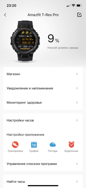Помимо настроек и хранения данных тренировок и мониторинга здоровья через приложение обновляется прошивка часов и устанавливаются большинство циферблатов. Список приложений, уведомления которых дублируются на экране часов, также настраивается через Zepp.