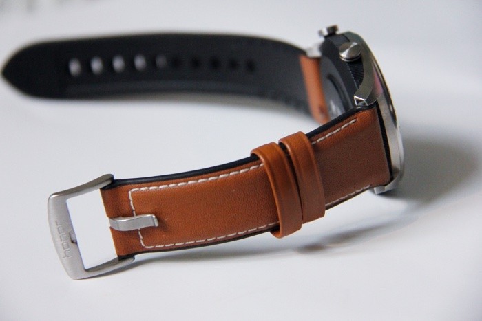 Второй вариант показался мне менее предпочтительным. На фото ниже видно, что на светлом корпусе отчетливо виден стык верхней металлической части и пластикового основания. Кроме того, ремешок с кожаной вставкой показался менее удобным, так как демонстрирует большую упругость.