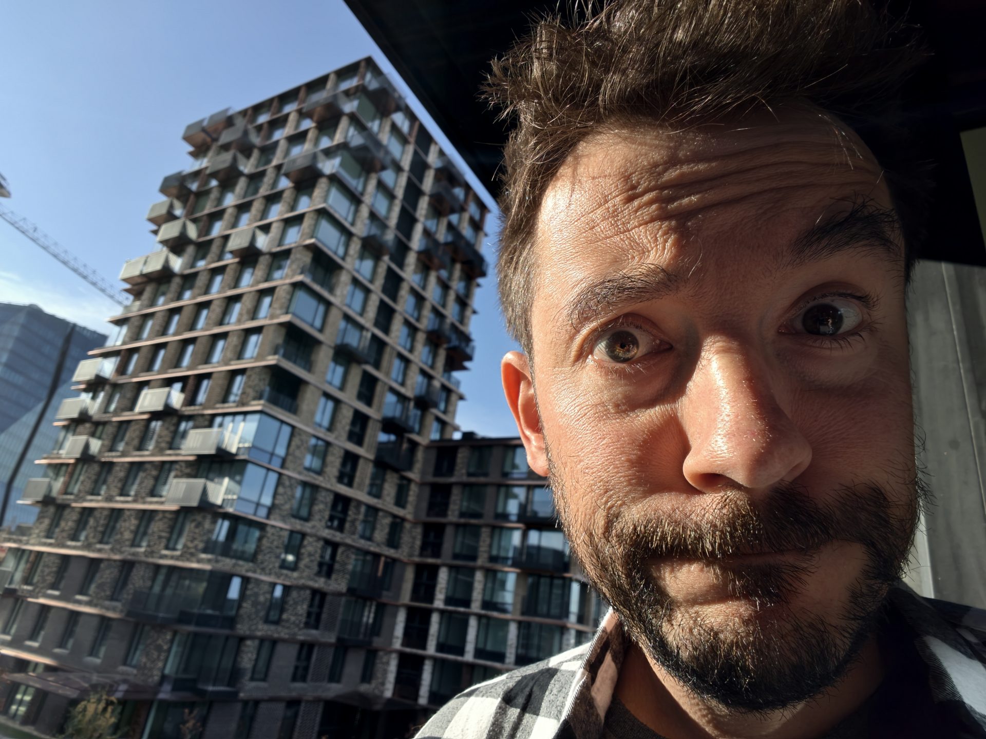 Фронтальная камера — одно из самых очевидных обновлений в этом году: 50-мегапиксельный модуль с автофокусом заменил 32-мегапиксельный модуль с фиксированным фокусом, использовавшийся в прошлые годы. Это очень приятное нововведение, позволяющее делать резкие снимки крупным планом, а также получать более чёткие изображения на расстоянии вытянутой руки. Цветопередача отличная, динамический диапазон довольно широкий, детализация отличная при хорошем освещении, но ухудшается при слабом освещении.
