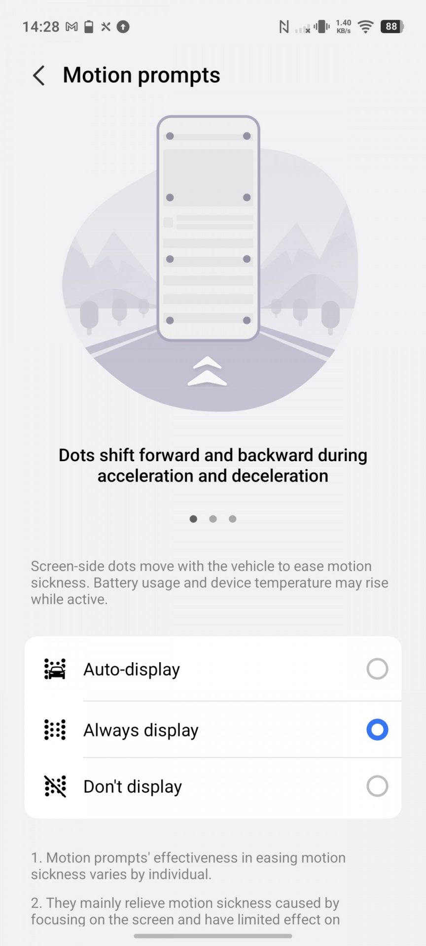Функция, которую мы раньше не видели, — это подсказки движения. Она предназначена для борьбы с укачиванием, отображая на экране набор точек, которые отражают движение автомобиля, в котором вы находитесь, на основе данных акселерометра телефона. Мы не уверены, насколько она эффективна, но если вы страдаете от головокружения, когда едете по извилистой дороге и смотрите в телефон (разумеется, на пассажирском сиденье), возможно, стоит попробовать.