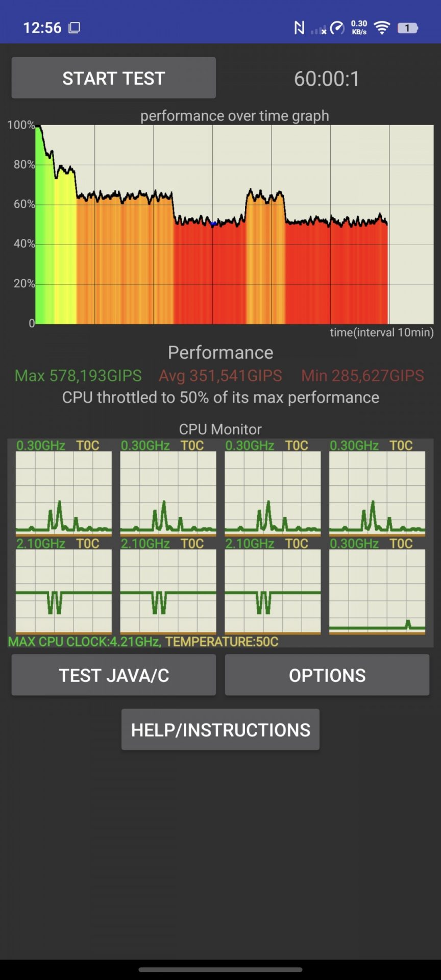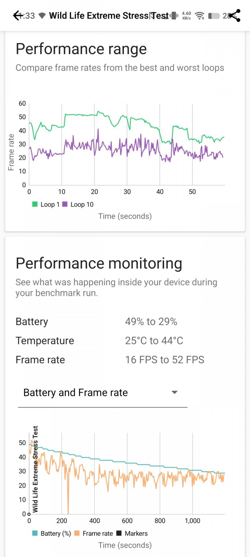 При длительной нагрузке X300 Pro не сильно отличался от большинства топовых смартфонов последнего времени. Мы наблюдали резкое падение производительности процессора: примерно за 7 минут она упала до чуть более 60% от первоначального результата, а затем в тесте CPU Throttling упала ещё больше, до половины от начальных значений. Стресс-тест 3DMark Wild Life Extreme показал рейтинг стабильности 59% — этот уровень телефон установил на 7-й минуте тестирования. В целом, это немного лучше, чем у Oppo Find X9 Pro, и примерно на уровне Xiaomi 17 Pro Max.