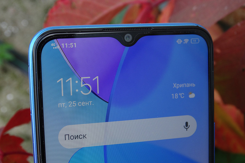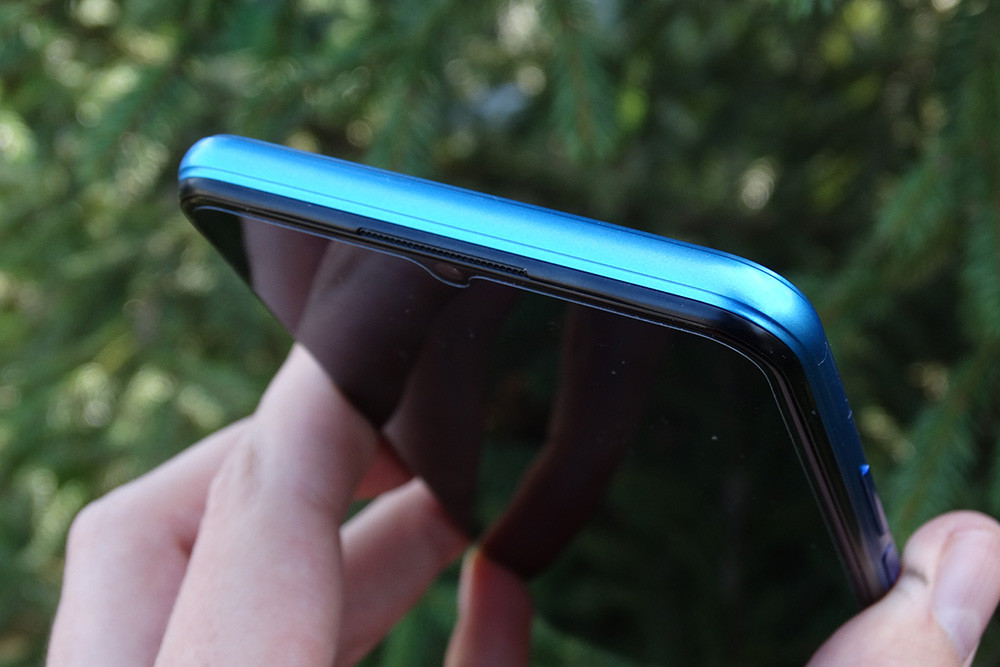 Еще одна особенность в том, что дисплей получился длинным (15,1 см) из-за пока не совсем типичного соотношения сторон 20:9. Для передней камеры в верхней части экрана сделан привычный каплевидный вырез, а рамки вокруг дисплея получились довольно тонкими, но не настолько, чтобы это приводило к ошибочным нажатиям.