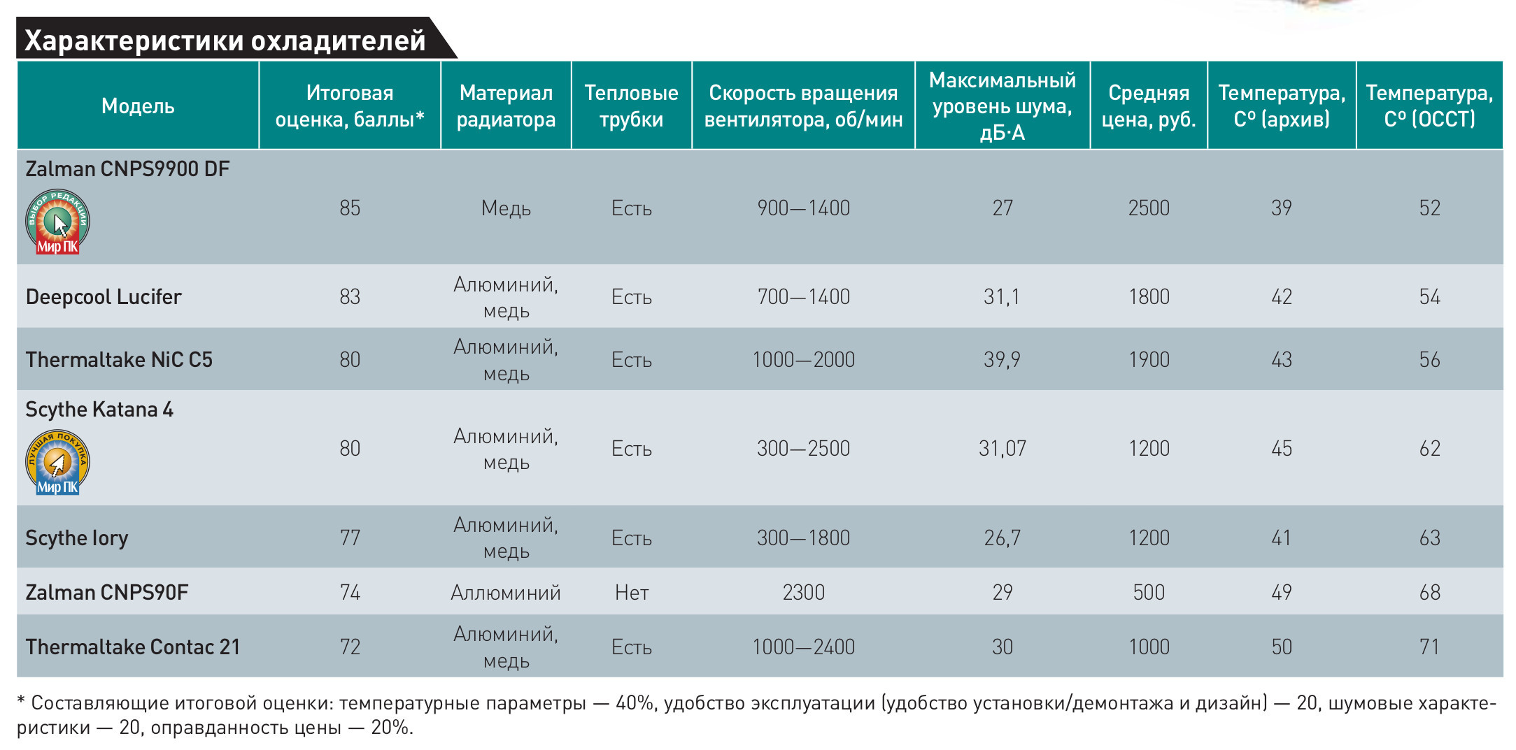 Как показали испытания, все протестированные охладители успешно справляются со своей задачей, обеспечивая достойный отвод тепла. Но больше всего нам понравился Zalman CNPS9900 DF, который показал хорошие результаты. Ему-то мы и присудили значок «Выбор редакции». А тем, кому нужен недорогой охладитель, стоит обратить внимание на Scythe Katana 4, отличающийся наилучшим соотношением цена/качество. Он и получил значок «Лучшая покупка».