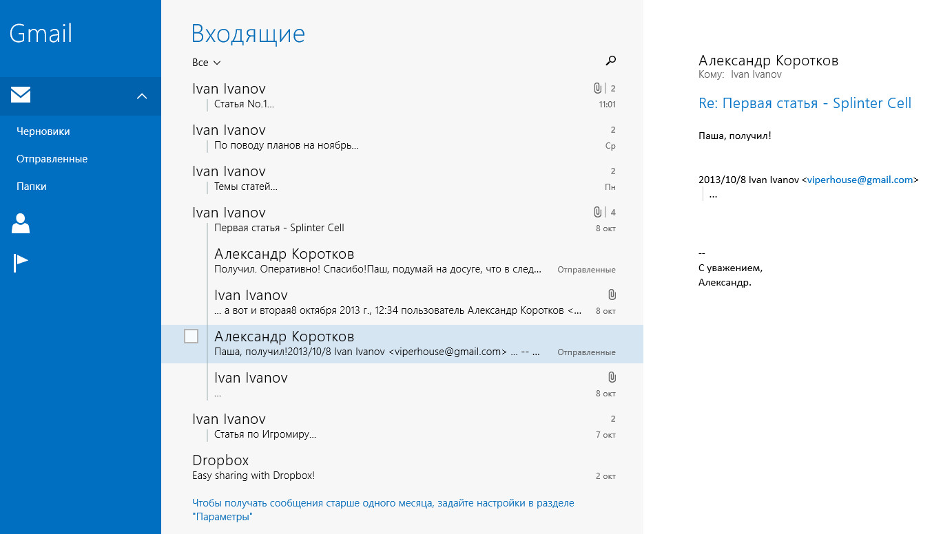 | Обновленное приложение «Почта» в версии Windows 8.1 выполнено в стиле Outlook.com |