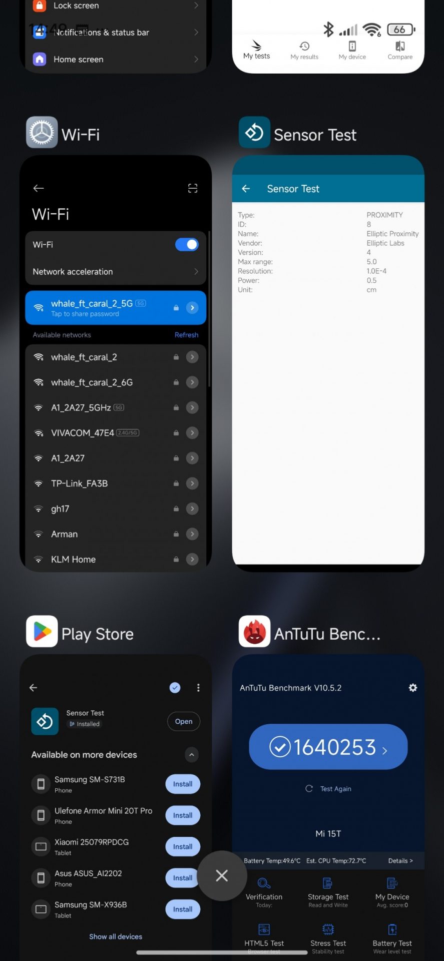 Что касается датчиков, то в Xiaomi 15T установлены акселерометр и гироскоп TDK ICM45621, магнитометр и компас MEMSIC MMC5603, а также датчик освещённости AMS TSL2522. К сожалению, аппаратного датчика приближения нет. Вы получаете только виртуальную реализацию от Elliptic Labs, которая неплохо справляется с отключением дисплея во время звонков, но всё же не идеальна. Несколько досадно, что Xiaomi сэкономила на аппаратном датчике приближения для устройства с таким богатым набором функций.