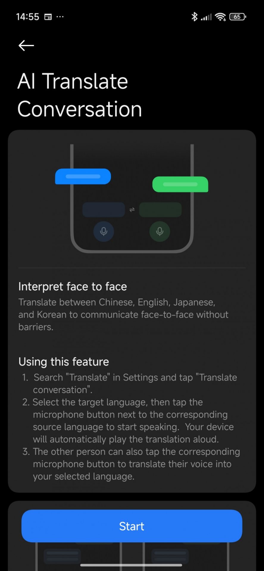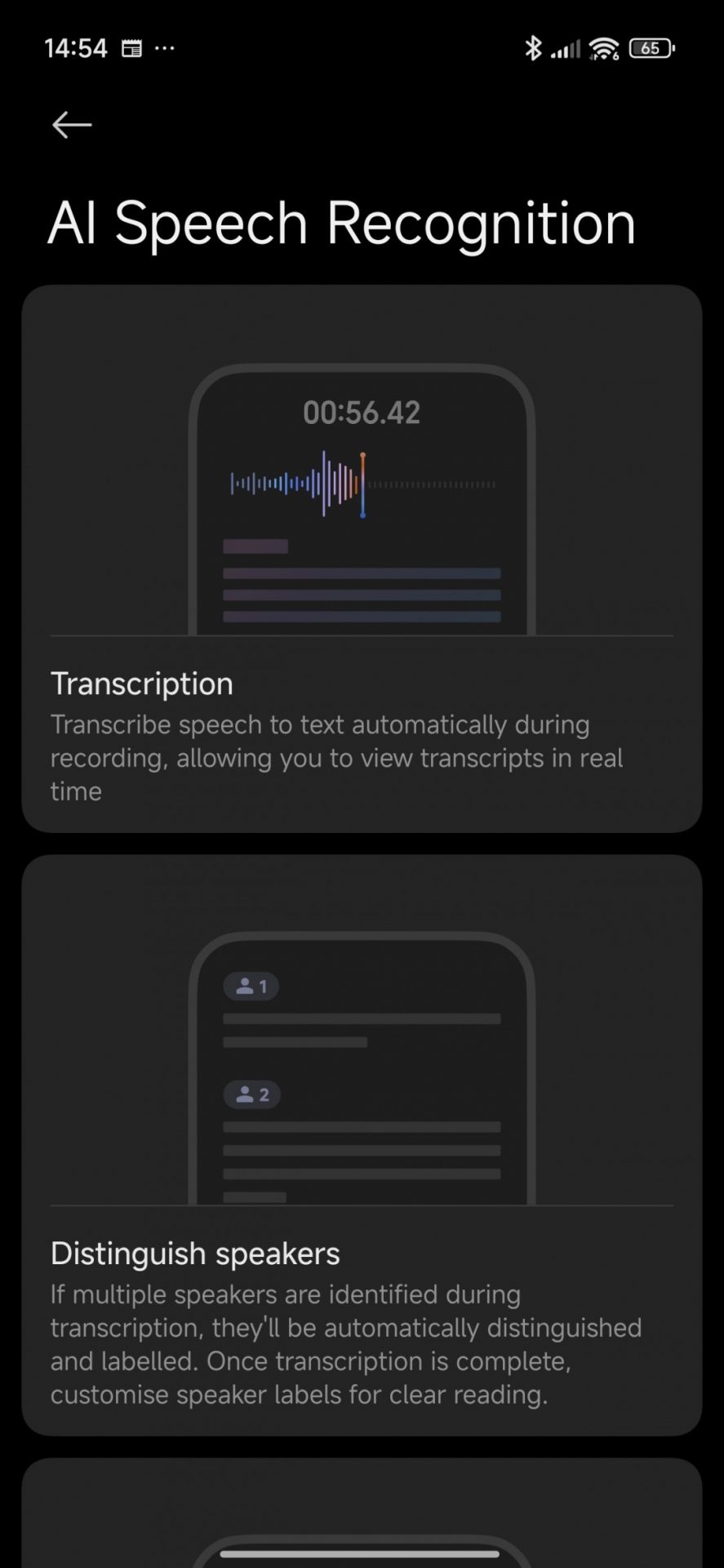 Приложение «Диктофон» может выполнять автоматическую расшифровку с распознаванием и разделением говорящих, а также переводить расшифровки. Вы можете включить системные субтитры с помощью ИИ для просмотра мультимедиа. Также есть ИИ-переводчик, который может выполнять как устный, так и телефонный перевод.
