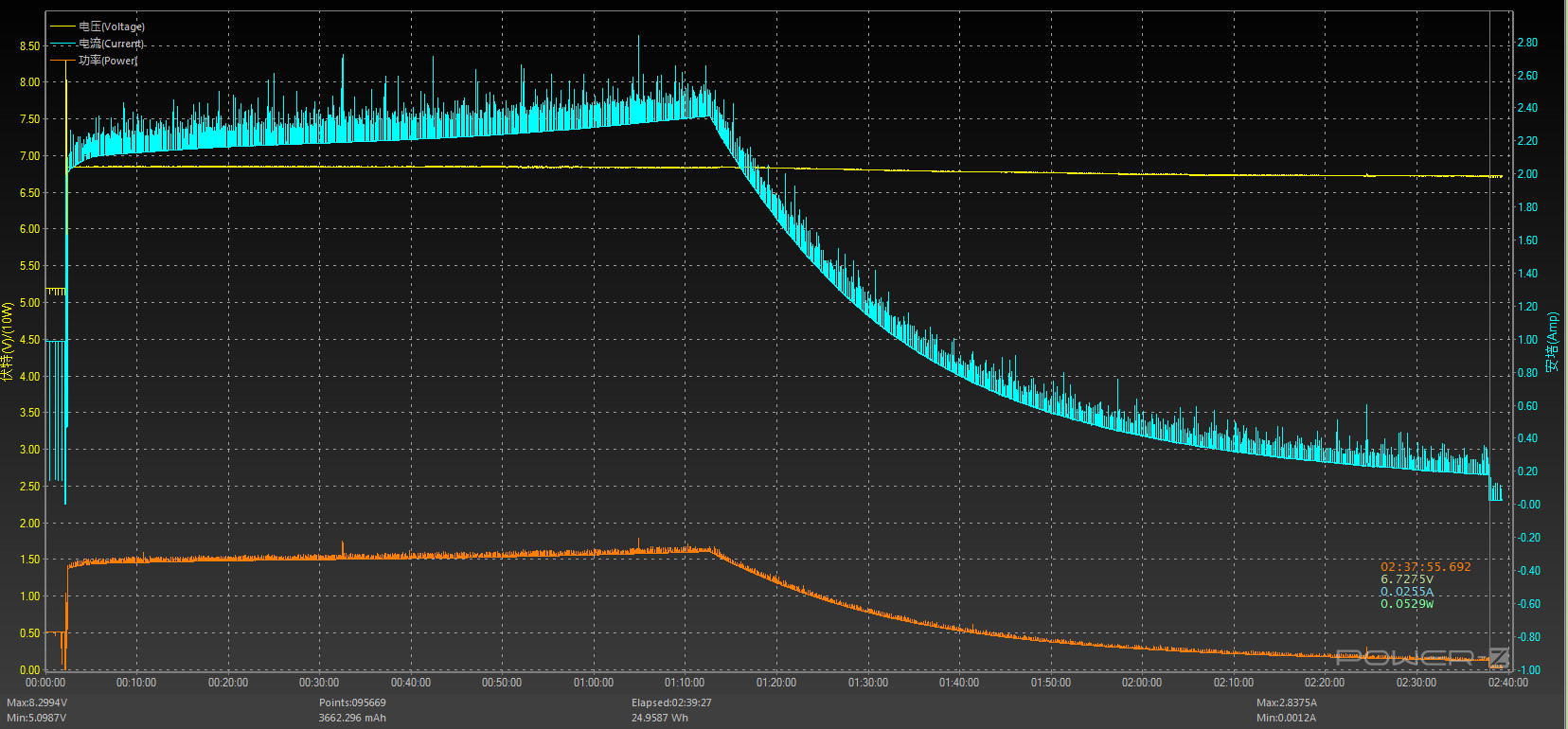 Максимальная мощность зарядки смартфона составила примерно 16 Вт (6.8 вольт и 2.35 ампера), а фактически зарядка заканчивается через 2 часа 35 минут при полностью разряженном аккумуляторе. Впрочем, процентный индикатор заряда отображает 100% на 25 минут раньше, и уже в этот момент можно смело снимать смартфон с зарядки — на автономности это почти никак не скажется. За 30 минут девайс заряжается на 31%, а за час — на 64%, что, конечно, далеко не рекорд.