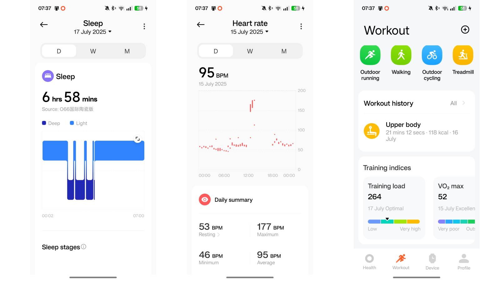 Больше всего информации вы получаете от таких режимов, как бег или езда на велосипеде, где вы можете видеть темп, шаги, частоту сердечных сокращений, каденс, длину шага и многое другое, а также средние значения и графики вашей тренировки. Приложение также отображает эффект вашей тренировки с помощью различных показателей.