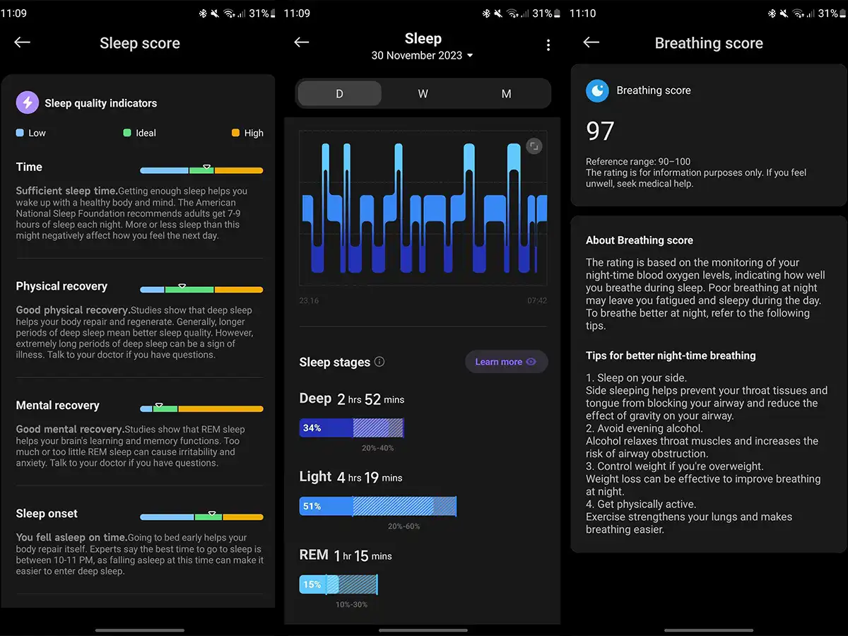 Вы получаете обзор того, как долго вы спали, а также сколько времени вы провели в каждой стадии (легкой, глубокой или быстрой) и как это соотносится с тем, что вы должны получать. В сочетании с данными о частоте сердечных сокращений и дыхании (если они включены) вы получаете общий «балл сна» из 100.