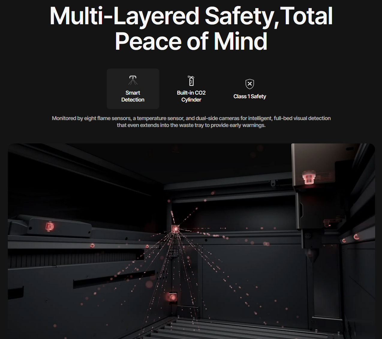 Итак, xTool P3 — это, безусловно, мощный инструмент, но он также обеспечивает (каламбур не случаен) повышенную безопасность. Мы несколько скептически отнеслись к тому, что в лазерных установках P2 некоторые функции безопасности доступны только в качестве дополнительных опций, но в случае с P3 это не так. Новый флагман сертифицирован как устройство класса 1 (улучшенный класс 4 по сравнению с P2). Он также оснащён восемью датчиками пламени и датчиком температуры для контроля рабочего пространства. Это подтверждается наличием встроенного баллона с углекислым газом для тушения пламени (в настоящее время входит в комплект поставки).