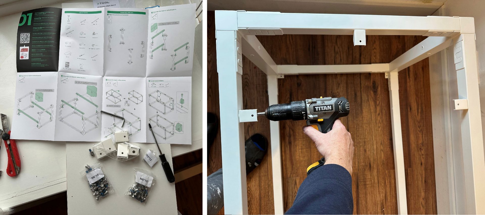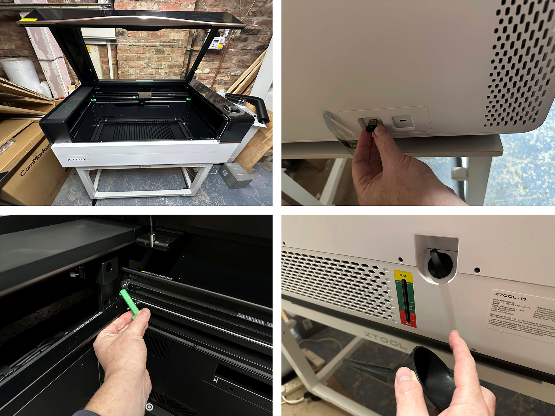 Установить xTool P3 на подставку и внутрь неё было непростой задачей. К счастью, мне удалось уговорить трёх крепких соседей помочь мне достать P3 из упаковки и установить на подготовленную мной подставку. Для распаковки устройства рекомендуется привлекать четырёх человек. Пожалуйста, следуйте инструкциям, чтобы избежать непредвиденных травм.
