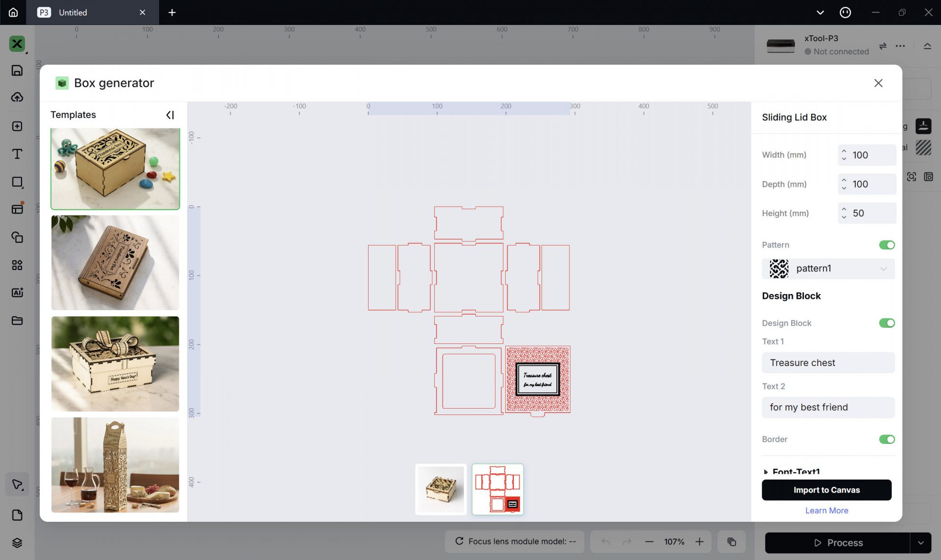 Я также хотел опробовать одно из встроенных приложений xTool Studio под названием Box Generator. Эта машина отлично справляется с изготовлением фанерных коробок, как я убедился на примере ламп для Хэллоуина. С помощью этого встроенного приложения можно легко создать коробку любого размера с необычными крышками, ползунками, петлями и многим другим.
