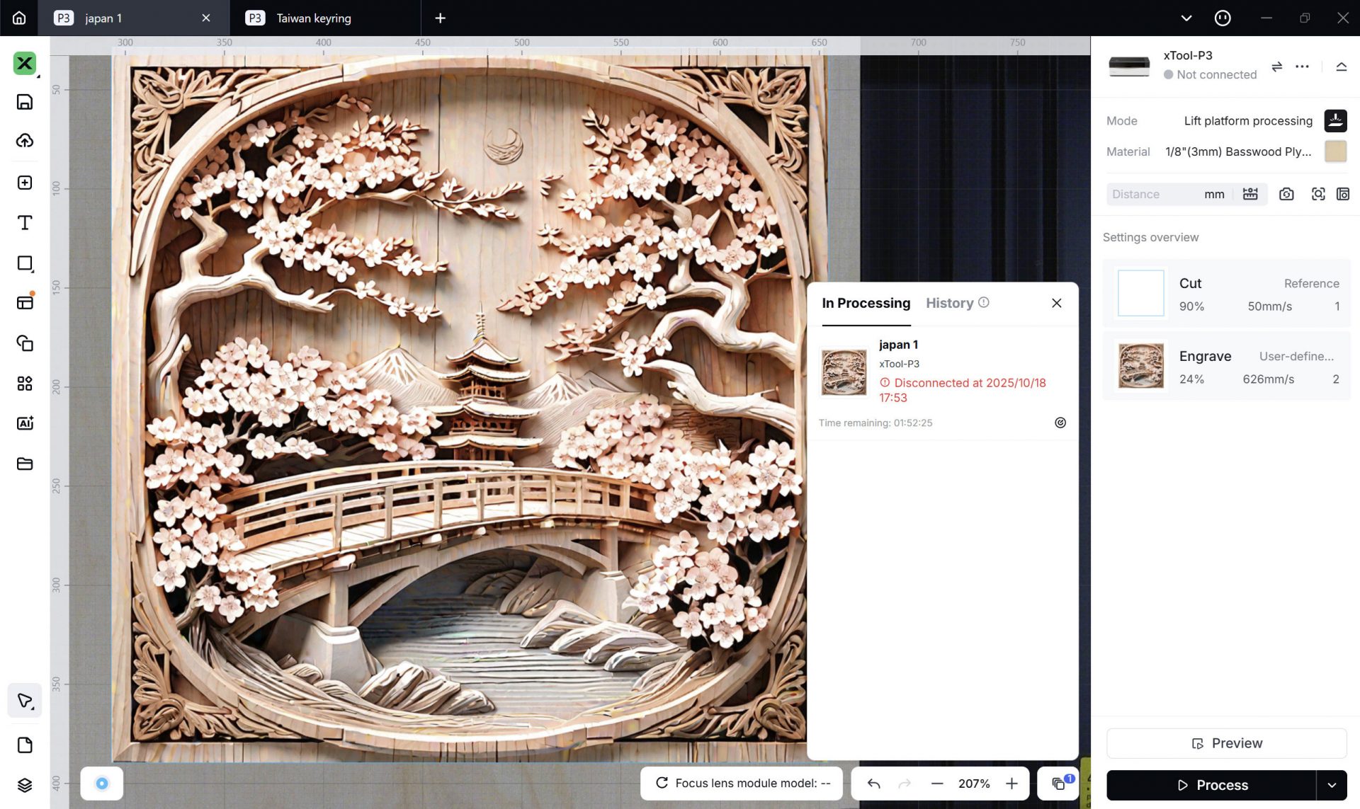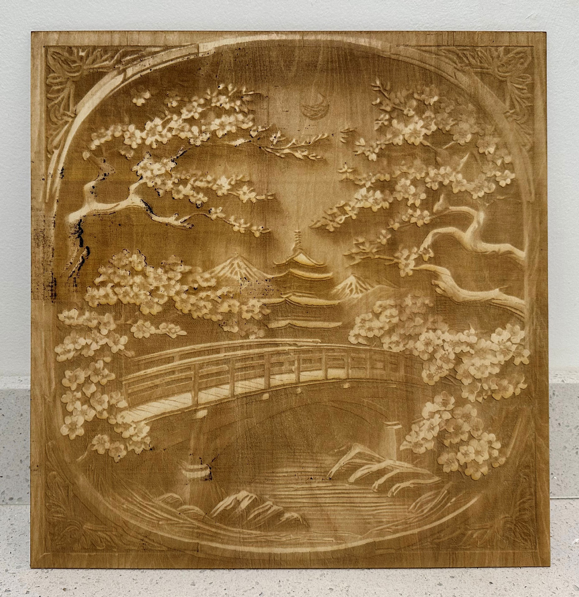 Последним моим лазерным рисунком на дереве была большая картина с изображением японского храма площадью около 50 кв. см, созданная с помощью искусственного интеллекта. Опять же, это можно сделать в программе xTool.