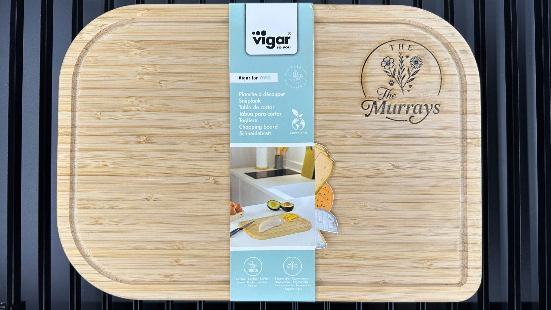 После того как я завершил тестовую матрицу для гравировки на дереве и провёл ещё одно тестирование на запасном кусочке бамбука, моим первым проектом стала бамбуковая разделочная доска, которую я подарю семье моей дочери на Рождество (только не говорите им об этом).
