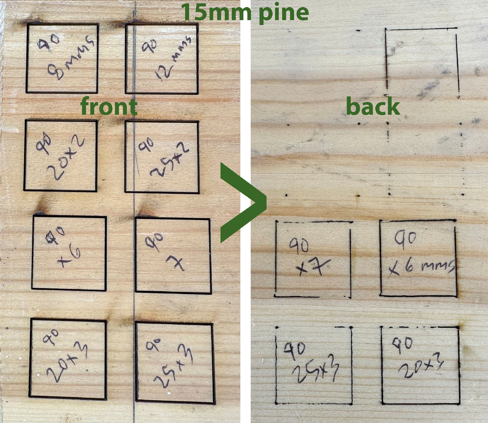 Я определил, что сосну толщиной 15,5 мм можно распилить при мощности 90 % и скорости подачи 5 мм/с (1 проход). Для менее обжигающего эффекта можно использовать мощность 90 %, скорость подачи 20 мм/с и четыре прохода.