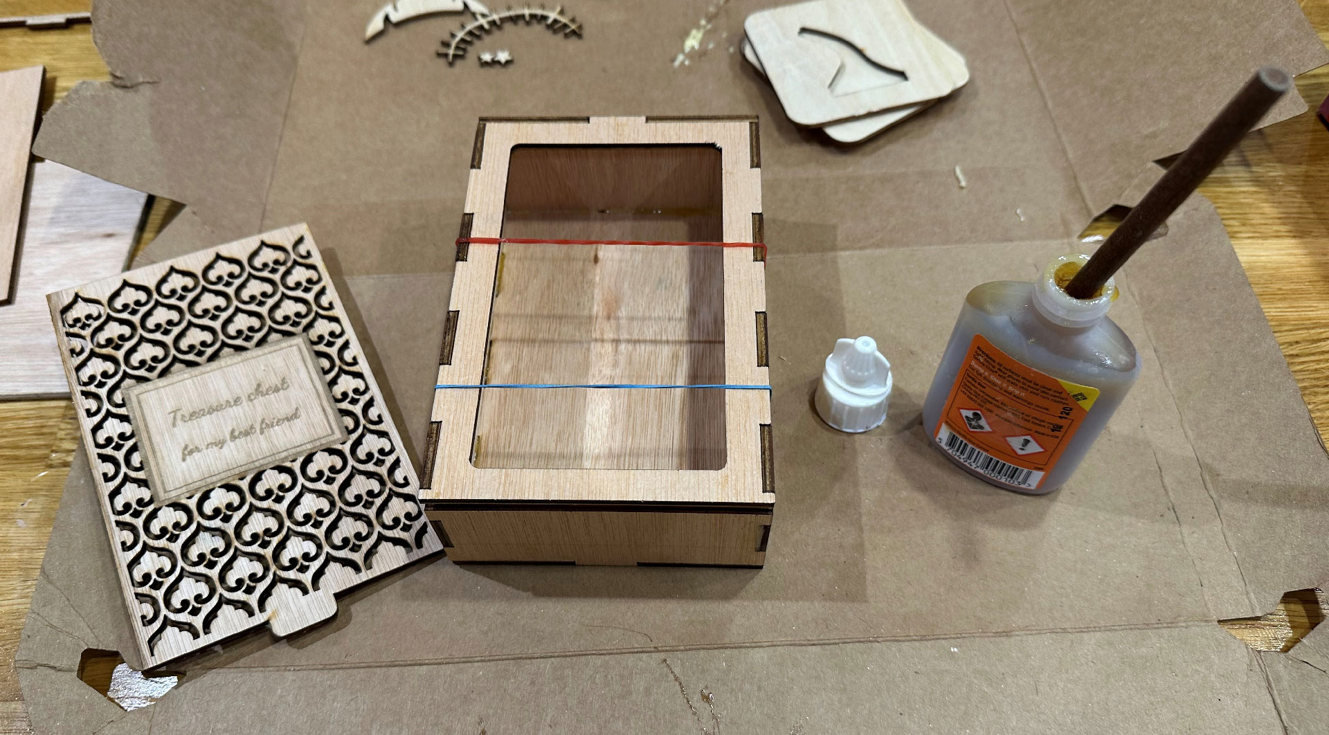 Благодаря минимальной гравировке — в основном резке — работа была выполнена быстро. Затем её нужно было только склеить. Все стыки были идеально подогнаны и расположены. При использовании генератора одним из важных параметров является толщина материала. Для этой работы я использовал более толстый слой — 3,6 мм.