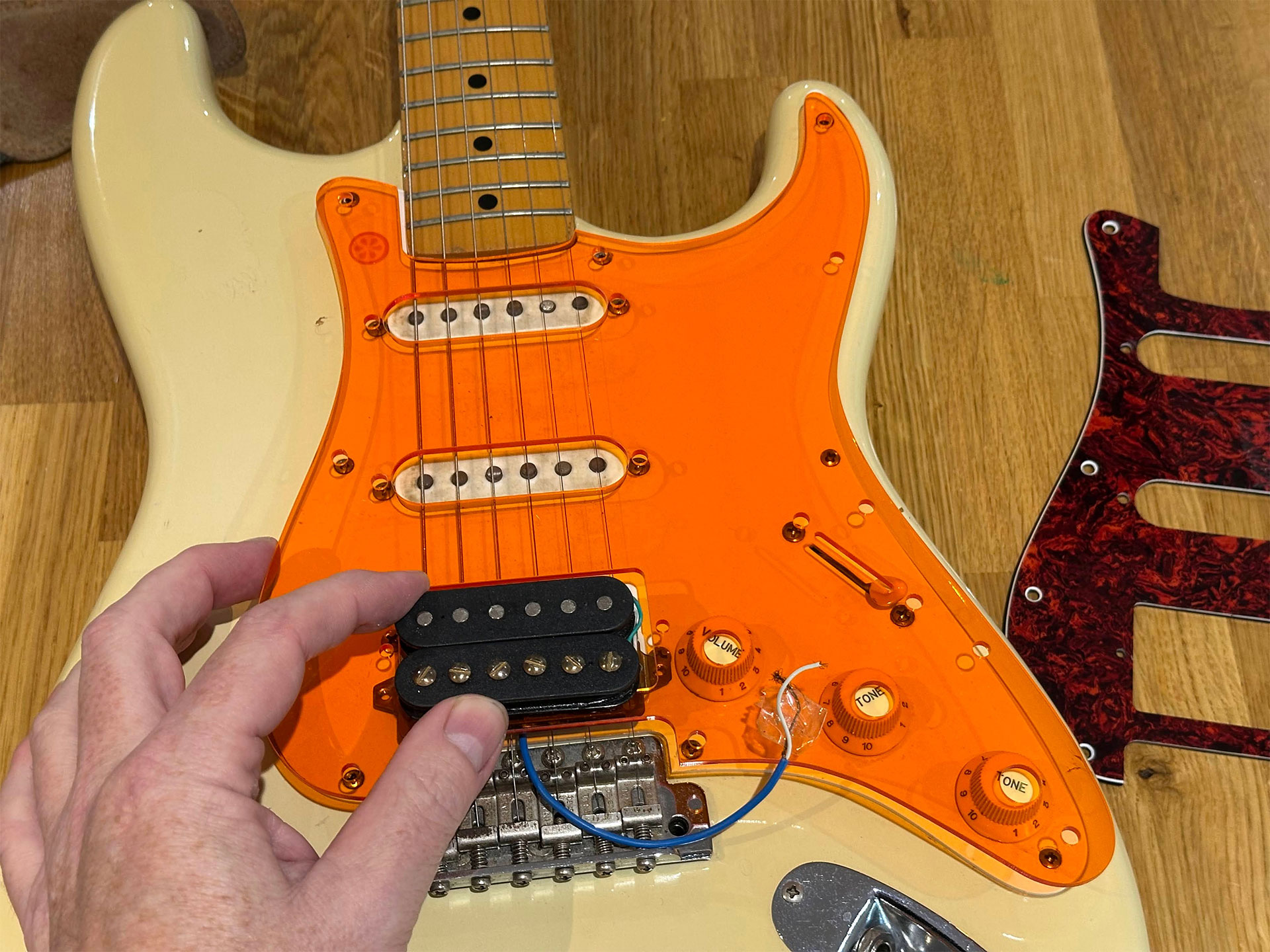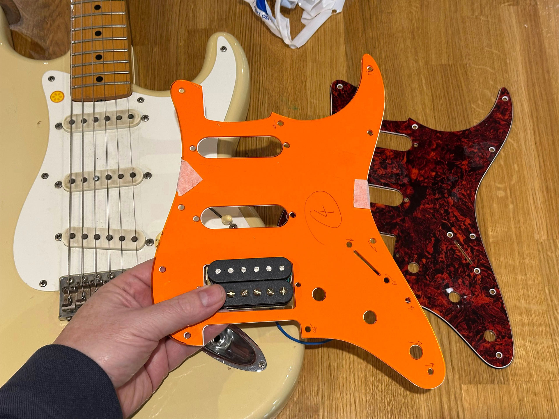 На фотографиях вы можете увидеть оригинальную белую накладку и купленную мной красную накладку с эффектом черепахового панциря, предназначенную для бриджевого хамбакера, которым я пользовался несколько лет. Я решил сделать копию последней и аккуратно вырезать её из прозрачного оранжевого акрила.