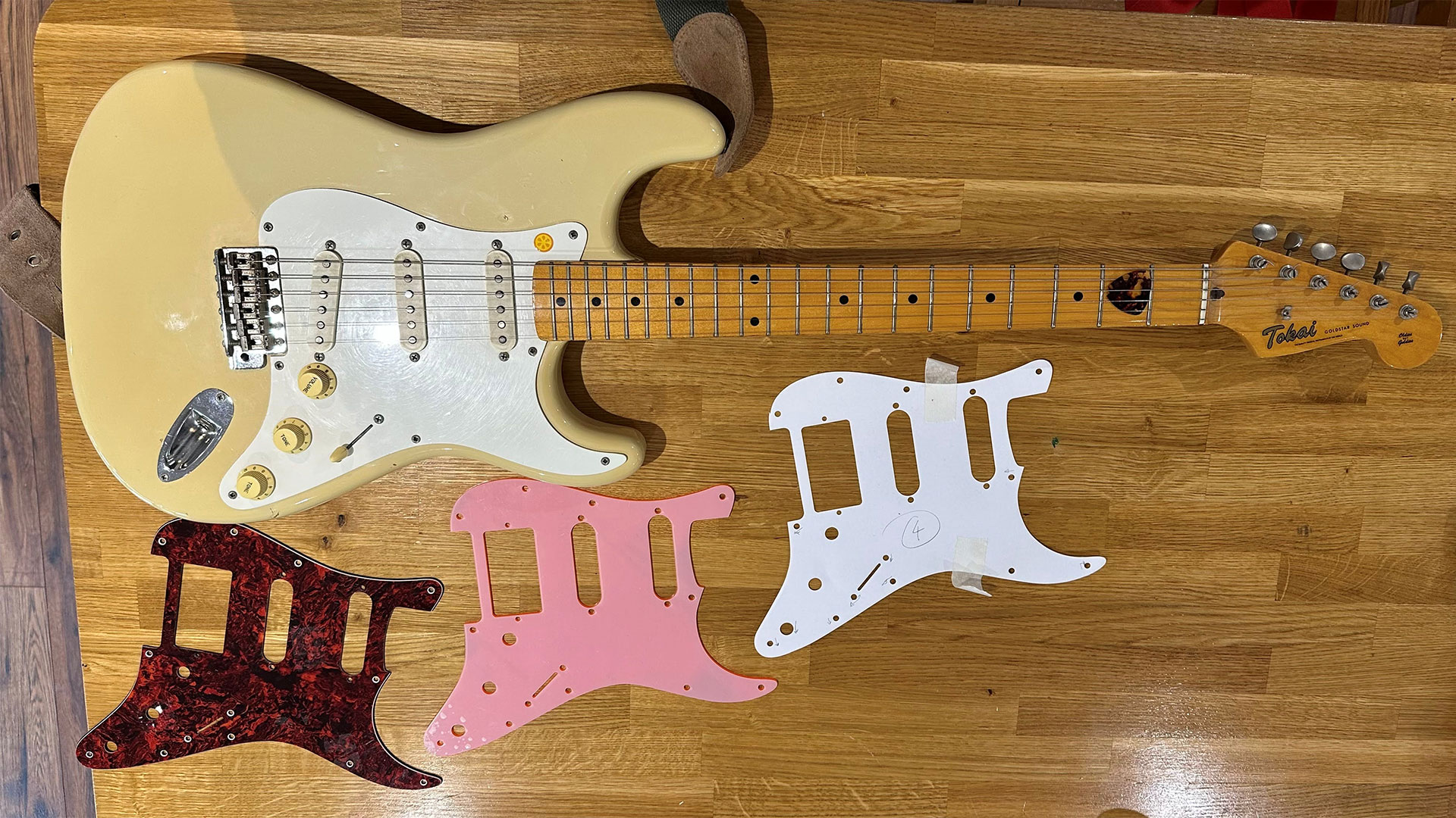 Наложение вырезанной лазером пластины для скрэтча на купленный образец и на гитару убедило меня в том, что они отлично подойдут друг к другу. Я жду два новых звукоснимателя с одной катушкой, чтобы полностью заменить пластину для скрэтча, так что это можно будет сделать быстро и легко.