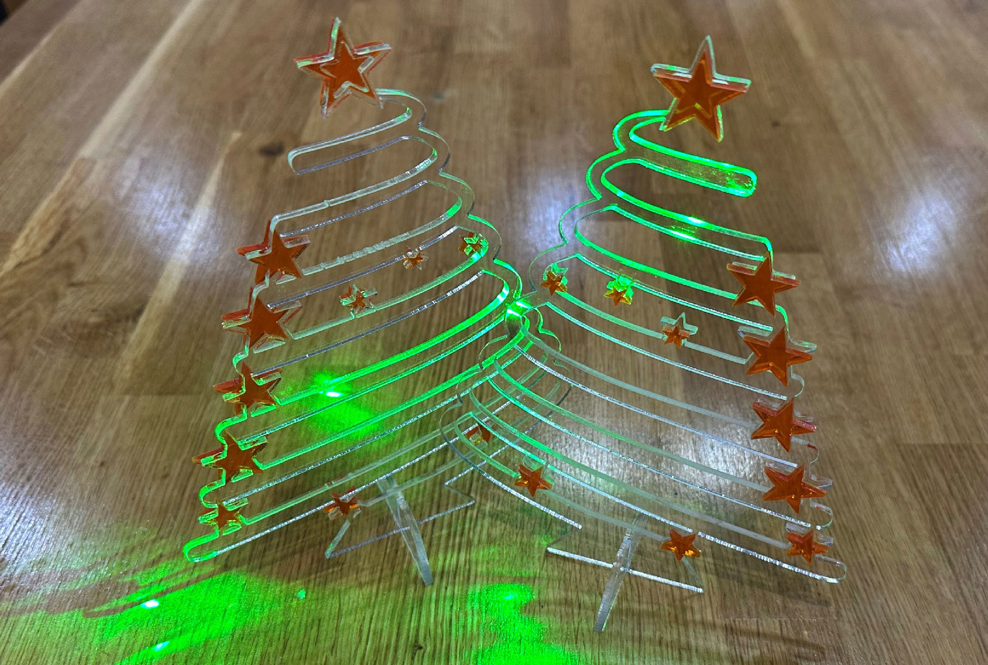 Вот ещё один проект из онлайн-библиотеки программного обеспечения xTool. Ещё один сезонный проект. Я немного изменил его, убрав текст, который был слишком мелким для печати в таких размерах. Кроме того, я добавил несколько оранжевых звёздочек, так как «деревья» из прозрачного бесцветного плексигласа выглядели слишком скучно. Я воздействовал на них лазерным лучом, чтобы добиться эффекта, показанного в галерее изображений ниже.