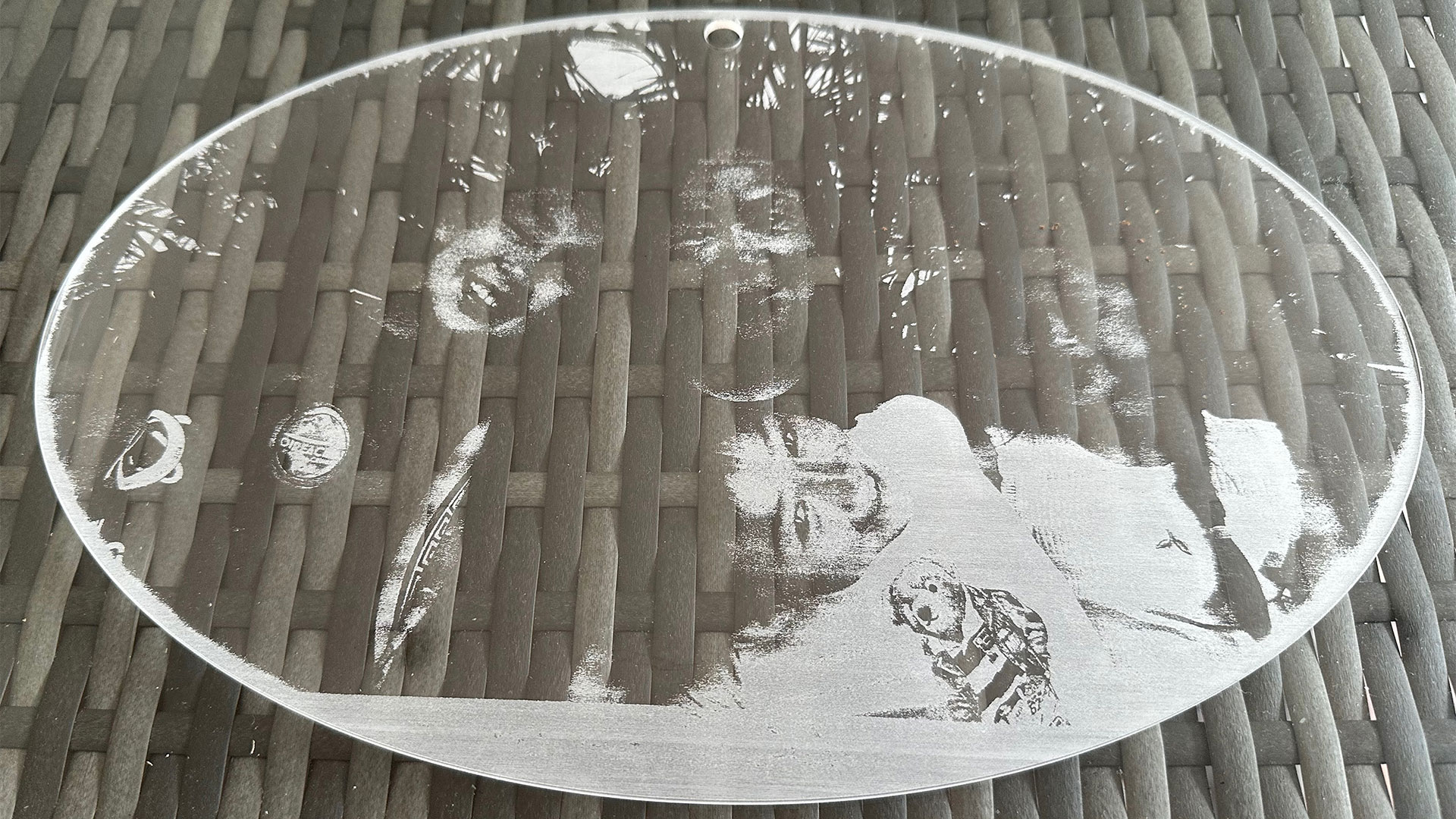Обработка заняла около 40 минут. Как я уже упоминал ранее, гравировка при низком энергопотреблении на таких станках выполняется медленно. Несмотря на мои старания, фотография получилась слишком тусклой, чтобы можно было разглядеть лица большинства членов семьи.
