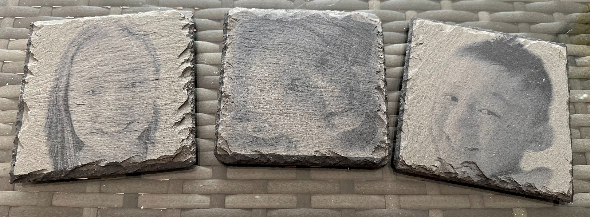 На семейных фотографиях видно, что все они приятно чёткие и имеют достаточную контрастность на сланце. Я вывожу их по одной, чтобы настроить предложенные xTool параметры, но на самом деле я считаю, что первый вариант был лучшим — вероятно, из-за разницы в оттенках на каждой фотографии. На P3 обработка каждой подставки занимала около 15 минут. Затем нужно промыть её и дать высохнуть, чтобы увидеть готовое изделие.