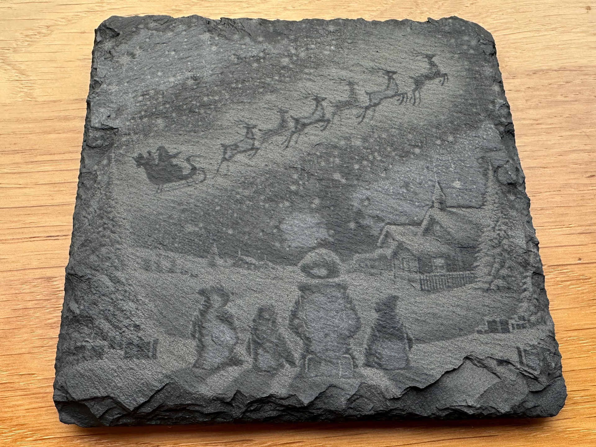 Мой последний тест — стоковое изображение рождественской сцены на подставке из сланца — показал, что более детализированная и мультяшная графика может выглядеть так, будто она была создана с помощью xTool P3.