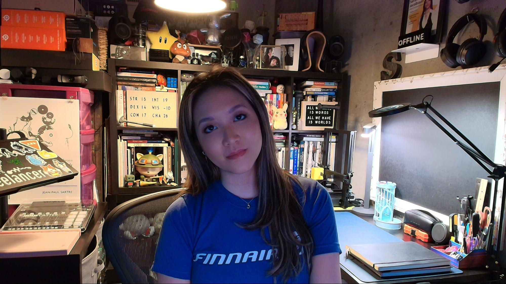 Следующий этап — тест на переэкспонирование (сложный контровой свет). Я выключила все источники света перед собой (кроме монитора), но зажгла лампы на фоне и сверху. Для большинства домашних пользователей это самый жизненный сценарий: мало у кого на столе стоят профессиональные софтбоксы, зато потолочное освещение бьет прямо в макушку.