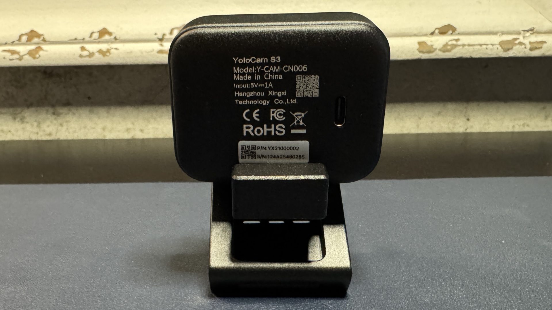 Внешне YoloCam S3 выглядит просто отлично. В её дизайне безошибочно читается легкое ретро: матовый черный металл лицевой панели с приятной текстурой под кожу и кольцо с металлической гравировкой вокруг объектива. Смотрится стильно, но кольцо тут исключительно декоративное — оно не крутится, как у Razer Kiyo V2. И тут мы подходим к главной боли: у камеры нет встроенной защитной шторки и даже простенькой крышки в комплекте. Для стационарного устройства, которое нельзя просто сложить (как Insta360 Link) или отвернуть к стене, это серьезный промах. Да, можно просто оторвать её от магнита, но так можно поступить с любым гаджетом. На передней панели горит крошечный светодиод активности, но лично мне его маловато, чтобы чувствовать себя уютно, когда на меня круглыми сутками смотрит 4K-объектив с нейросетями.