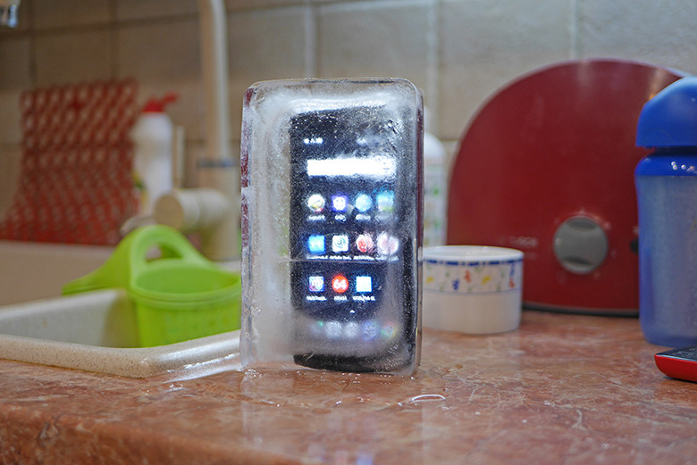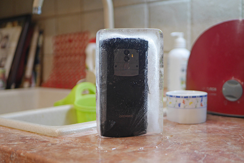 В Doogee говорят, что модель S55 защищена по стандарту IP68. То есть от пыли (корпус на 100% герметичен) и от воды (с аппаратом можно нырять на глубину до двух метров и тусоваться там до часа). Дабы подтвердить (ну или опровергнуть) неубиваемость Doogee S55, я провел ряд натурных тестов. У меня уже сформировался определенный набор испытаний, которыми я проверяю защищенные смартфоны, и герой этого обзора не стал исключением. Во-первых, Doogee S55 провел ночь в морозильной камере холодильника, будучи положенным в кадку с водой. На работоспособность смартфона это никак не повлияло. Утром я позвонил на него, и он принял звонок в оковах льда.