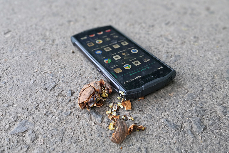 А еще я разбил с помощью Doogee S55 орех на асфальте. Результаты экзекуции оказался таким же позитивным, как и в случае замораживания. Смартфон выжил, а орех – нет. Итог – лишь пара-тройка мелких царапин на резине.