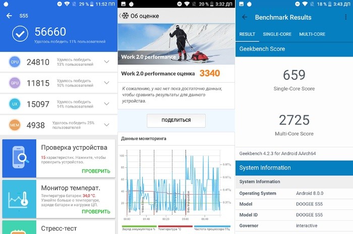 Не могу назвать чипсет MediaTek MT6750T – а именно он используется в Doogee S55 – прямо-таки верхом совершенства. Но, опять-таки, с учетом цены… Для смартфона ценой в 10 тысяч рублей это решение вполне достойное. Потому что оно обеспечивает достаточную для современных игр производительность и при этом обходится производителям смартфонов сравнительно недорого. Что, в свою очередь, позволяет продавать аппараты на MT6750T за вменяемые деньги. В MT6750T, если кто не помнит, восемь ядер Cortex-A53. Из них четыре способны разгоняться до 1 ГГц, а еще четыре – до 1,5 ГГц. Графический ускоритель – AMR Mali T860MP2 с частотой до 650 МГц.