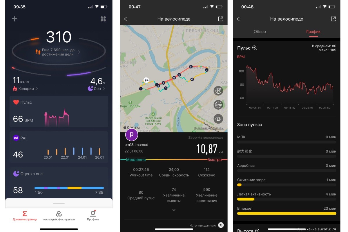 Вся статистика традиционно собирается в фирменном приложении Zepp. Оно хорошо локализовано, логично и удобно для использования. Не хватает разве что просмотра статистики по сну, и можно было бы сделать более понятными некоторые действия вроде настройки второстепенных шкал на циферблатах и удаления уведомлений.