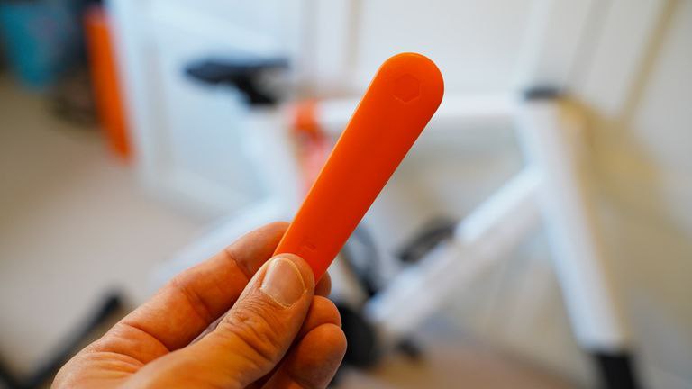 Сборка довольно проста, а если вы вдруг запутаетесь, то в интернете есть обучающие видео, доступ к которым можно получить, отсканировав QR-код на коробке. Чтобы упростить задачу, Zwift Ride был спроектирован таким образом, чтобы его можно было собрать с помощью всего одного инструмента: шестигранного ключа с оранжевой рукояткой, который хранится на раме.