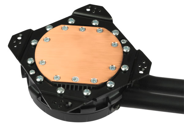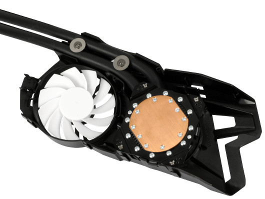 На графический процессор водоблок устанавливается с помощью четырех подпружиненных винтов и металлической пластины. В комплект поставки входят алюминиевые радиаторы разных размеров, предназначенные для охлаждения микросхем памяти и греющихся элементов преобразователя напряжения, питающего ГП. Сверху на водоблок устанавливается декоративный кожух. Вентилятор в нем расположен под углом, для того чтобы осуществлять обдув всей платы. Помпа, работающая с постоянной скоростью, питается от 12 В. Оба вентилятора системы можно запитать от разъема на видеоплате, обеспечив этим автоматическую регулировку их оборотов.