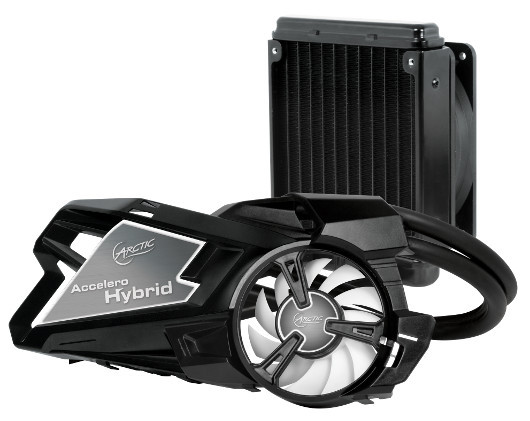 Система жидкостного охлаждения Arctic Cooling Accelero Hybrid совместима с различными производительными графическими решениями как от компании AMD, так и nVidia. Конкурентов на рынке у нее практически нет, подобные продукты можно перечесть по пальцам одной руки, и найти их в продаже достаточно сложно. Продукт рассчитан на энтузиастов, которым требуется получить максимум отдачи от используемой графической видеокарты. Средняя цена на эту систему составляет 4000 руб. Она поставляется в сборе, пользователю остается лишь приладить ее. Система состоит из водоблока, совмещенного с помпой, и внешнего алюминиевого радиатора, которые соединены между собой гибкими шлангами. Последний может крепиться как в задней части корпуса, так и в передней. Выполненное из меди основание, которое устанавливается на ГП, отполировано лишь удовлетворительно. Чтобы улучшить теплопередачу, его нужно как следует отполировать. В системе применяются два вентилятора. Первый, 90-мм, дополняет водоблок, воздушный поток от которого охлаждает силовые элементы платы и микросхемы памяти. Второй же, диаметром 120 мм, устанавливается на массивный основной радиатор. Он создает внушительный воздушный поток 125,7 м 3 /ч.