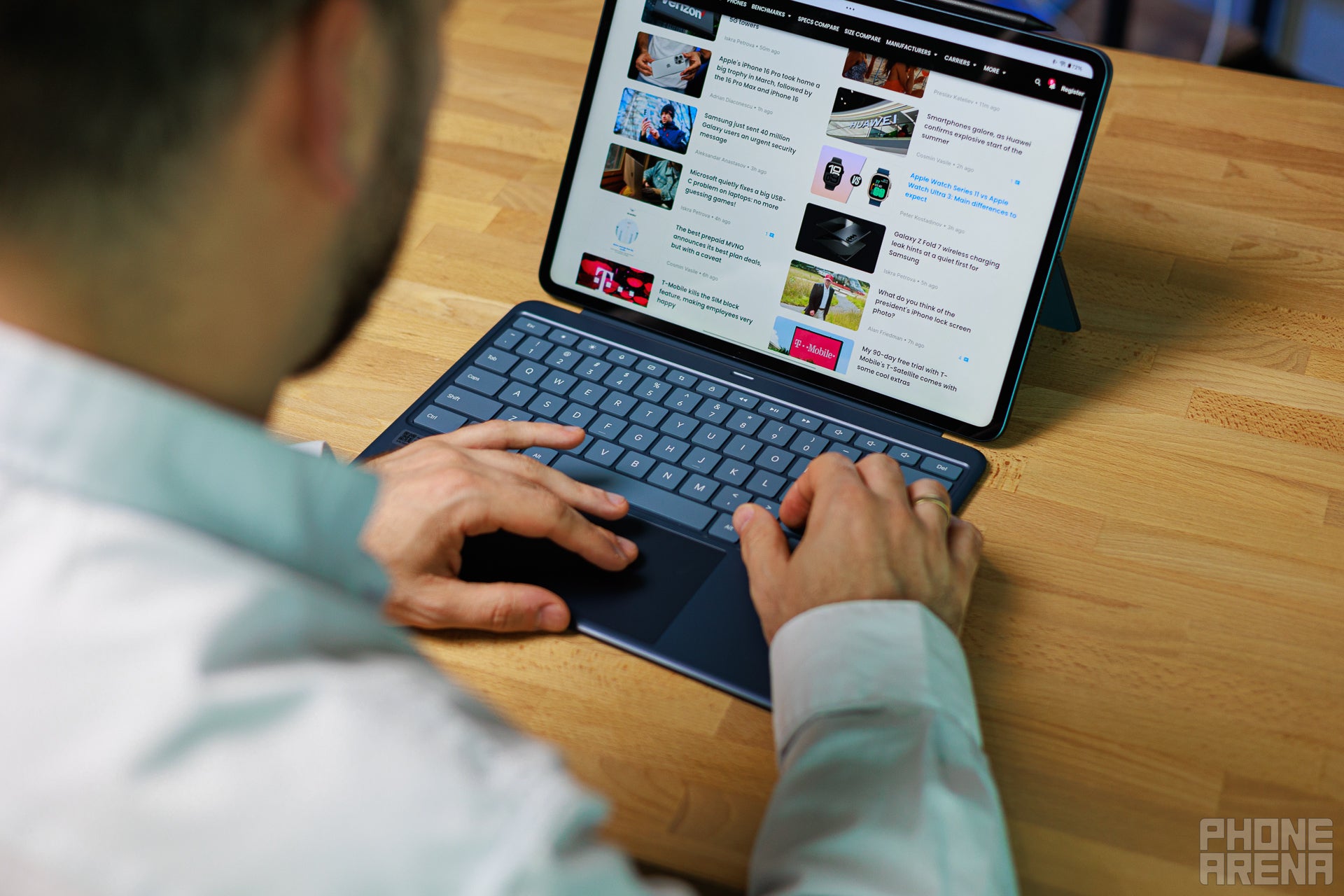 Аппаратная клавиатура Smart Keyboard также оснащена большим трекпадом с отличным откликом и плавной работой. Ускорение указателя (если оно вообще есть) ощущается немного странно, но это не так уж плохо и к нему несложно привыкнуть. Я считаю, что производителям планшетов лучше настраивать трекпады так, чтобы поведение указателя было похоже на то, что пользователи видят на Windows и Mac — это сделает переключение между планшетом и ПК более естественным. К сожалению, здесь нет поддержки касания двумя пальцами для вызова контекстного меню (правого клика мыши).