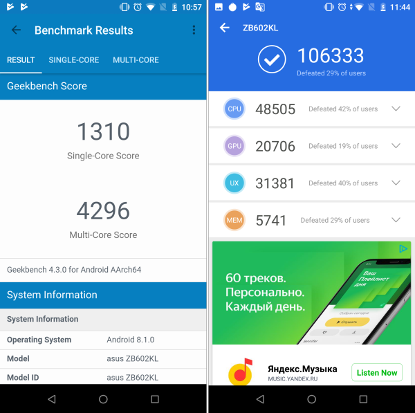ASUS ZenFone Max Pro M1 хорошо справлялся со всем, что было ему поручено за время тестирования — от простого повседневного использования (просмотра веб-страниц, использования приложений для социальных сетей, построение маршрутов на карте и прочее) до интенсивных рабочих нагрузок, вроде тяжелых приложений для обработки фото и видео и переключения между несколькими свернутыми ресурсоемкими приложениями. Даже тяжелые игры, такие, как недавно выпущенный Asphalt 9, работали без проблем, и телефон при этом нагревался совсем несущественно.