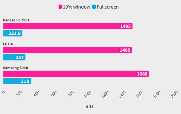 С OLED-панелью MLA, аналогичной той, что используется в OLED-телевизорах LG G4, я ожидал, что Panasonic Z95A будет иметь столь же высокую яркость, и мои измерения подтвердили это. Яркость на 10% белом окне HDR в режиме Filmmaker Mode составила 1495 нит, а полноэкранный шаблон — 182 нит. Эти цифры соответствуют тому, что мы измеряли на LG G4, но немного не дотягивают до 1688 нит и 318 нит у Samsung S95D в режиме Filmmaker.
