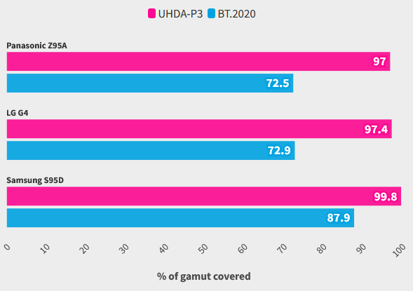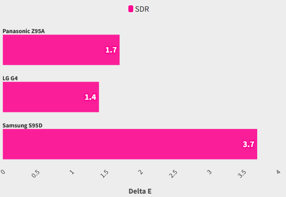 По результатам измерений, охват цветового пространства UHDA-P3 у Z95A в режиме Filmmaker составил 97.0, а охват BT.2022 — 72.5%. Опять же, эти цифры соответствуют тому, что мы измеряли на LG G4, хотя дисплейная панель Samsung QD-OLED обеспечивала полный охват P3 и охват BT.2020 на уровне 97.9%. Точность оттенков серого и цвета (подробнее см. в разделе «Точность цвета») в том же режиме составила 3.3 и 1.7 соответственно, что опять же соответствует производительности LG G4.