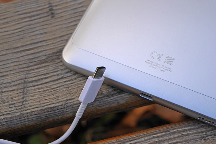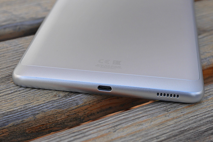 Что понравилось, так это наличие современного и удобного порта USB Type-C. Ранее его можно было встретить только в флагманском Galaxy Tab S3. Рядом с портом находится динамик. Громкость звука и его качество произвели приятное впечатление. Кино можно смотреть вдвоем, а то и втроем.