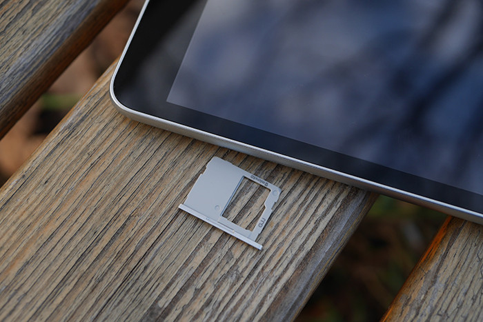 Слот для карты MicroSD реализован в виде съемного лотка. Для его извлечения необходимо задействовать скрепку, входящую в комплект поставки. Подозреваю, что такая конструкция более надежная, чем обычная заглушка на силиконовой ножке (и вновь вспомним Galaxy Tab 3 8.0). И все же лично мне нравится, когда никаких скрепок использовать не нужно. На фото ниже – тот самый съемный лоток. Ничем не заполненная серая площадка слева от гнезда под MicroSD имеет место быть не просто так. Вероятно, лоток унифицирован с версией T385, где есть LTE-модем. И в ней вместо серого пространства есть разъем под SIM-карту.