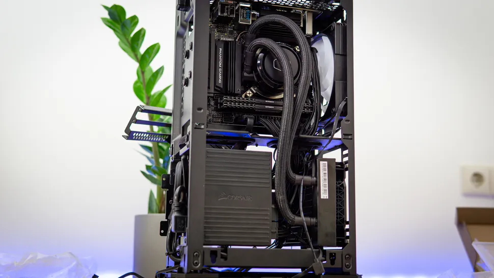 Я установил блок питания Corsair SF750 вентилятором внутрь, так как если бы он был направлен наружу, то находился бы слишком близко к стеклянной панели. Если вы используете вентилируемые боковые панели, можете направить вентилятор в любую сторону.