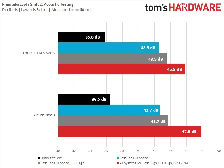 Конечно, такое улучшение теплоотвода сказалось на акустике, и я могу сказать, что корпус стал заметно громче из-за того, что сетка пропускала звук. При максимальной нагрузке на графический процессор мы зафиксировали самую большую разницу в акустике — до 2 дБ. В других сценариях корпус также работал громче и, по субъективным ощущениям, был менее тихим — уровень шума мог быть лишь немного ниже, но стеклянные панели отлично справляются с передачей резких звуков от подшипников вентиляторов и насосов, благодаря чему звук становится более ровным.