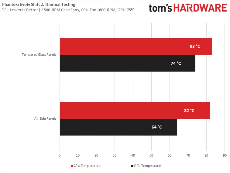 Компания Phanteks любезно предоставила нам панели, которые устанавливаются на версию Evolv Shift 2 с воздушным охлаждением. Как видно из этих таблиц, производительность версии со стеклянными панелями значительно ниже. Температура процессора в обеих версиях не сильно различалась, но установка сетчатых панелей на корпус снизила температуру графического процессора на целых 10 градусов, что весьма существенно.